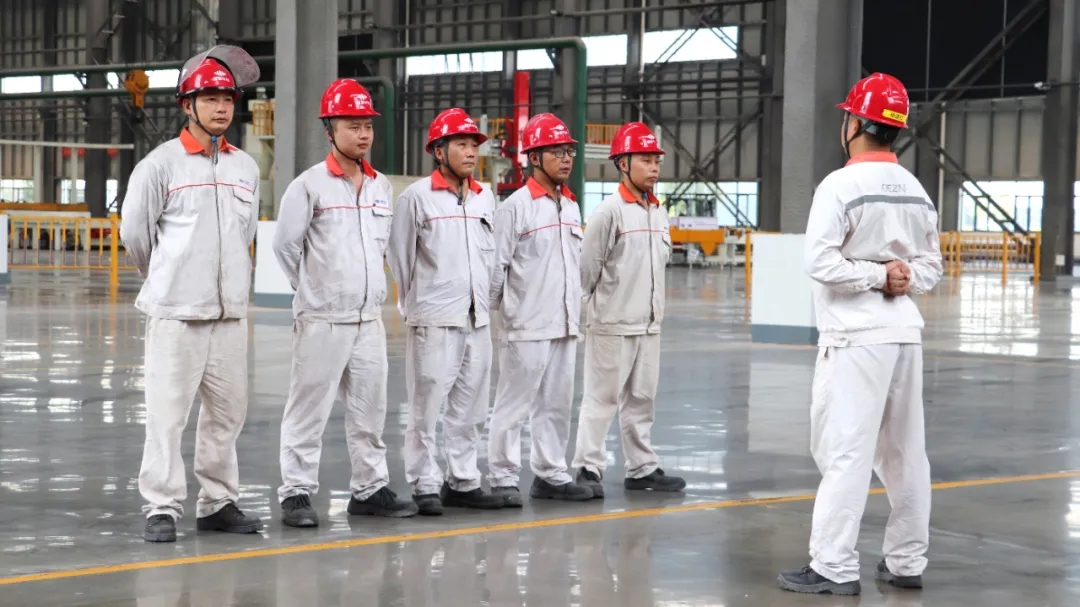 熔煉班承擔著鑫政產品原材的生產任務,作為熔鑄的首道生產工序,熔煉必須嚴格按照操作流程進行操作,確保物料種類、清潔度、重量、工藝等嚴格符合要求。班長楊建紅剛完成清早的第一次現場巡檢,“現場安全馬虎不得,這幾個月訂單激增,班組團隊兩班倒忙個不停。我作為班長,首要的就是要保障安全生產”,楊建紅說到,“要提高生產效率,關鍵就是一個快字,抓好生產與時間賽跑”。